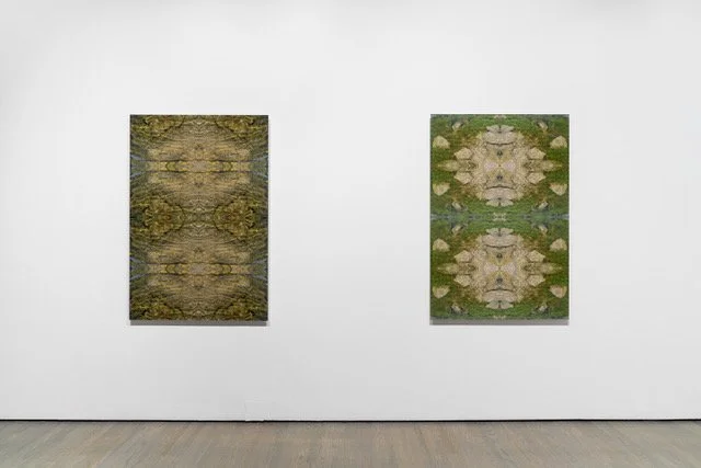 The series flatrocks (2024), which consists of four acrylic panels (137 x 91 cm each), also enlivens one’s gaze by directing one’s attention to minutiae – in this case the colors and textures of submerged rocks from along the shoreline of Kaniatarowànen (Figure 3). Claus digitized and transmuted the original photographs so that they form a kaleidoscopic pattern. The shininess of the acrylic surface of the panels augments the gleaming surface of the water covering the rocks, and so liquefies one’s gaze. Rather than ‘through a glass darkly,’ one perceives the rocks though water luminescently.