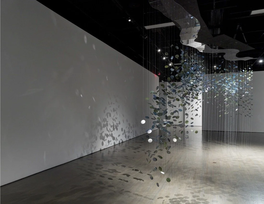 Figure 1: watersong [Kaniatarowanen – othorè:ke nonkwá:ti], 2025. Acrylic, thread, glass beads, digital prints on Jetview film, PVA glue 701 × 365 cm. Composer of the song: Ionhiarò:roks McComber. Photo credit: Jean-Michael Seminaro. Courtesy of the Leonard & Bina Ellen Art Gallery.