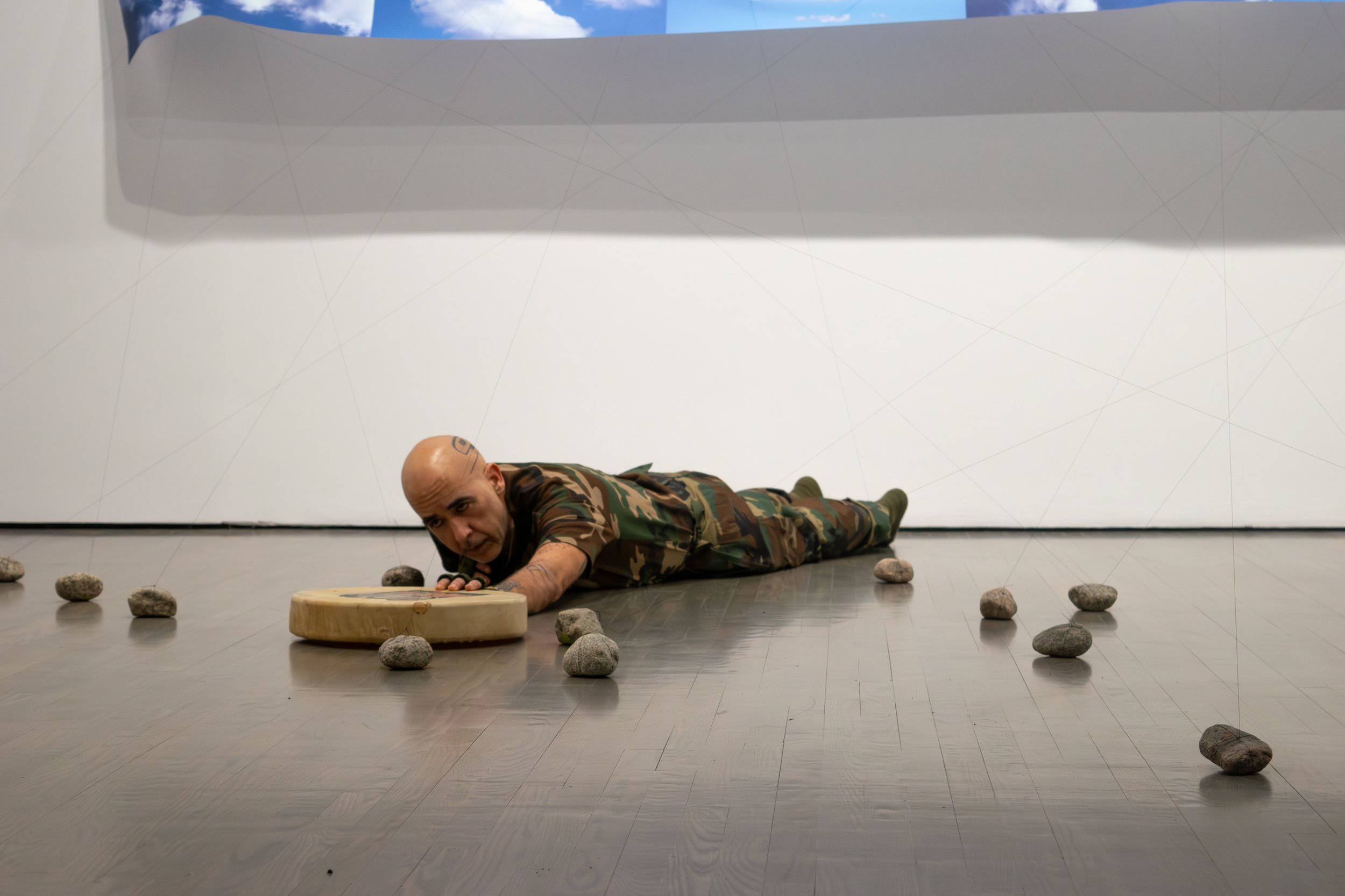 Morin does not comment on the artworks or ‘interpret’ them. Instead, he performs them. The kinetics of his performance are fascinating to behold. For example, when he moves, he does not walk upright, but rather slightly stooped, stepping gingerly on the tips of his toes rather than the balls of his stockinged feet. He is wearing camouflage clothing (Figure 6). This attire references two things. One is the camouflage garb of the Kanien’kehá:ka Warrior Society, protectors of the Earth, who confronted the Canadian Army during the Siege of Kanehsatà:ke, or what the Canadian media branded as the Oka Crisis, 1990.