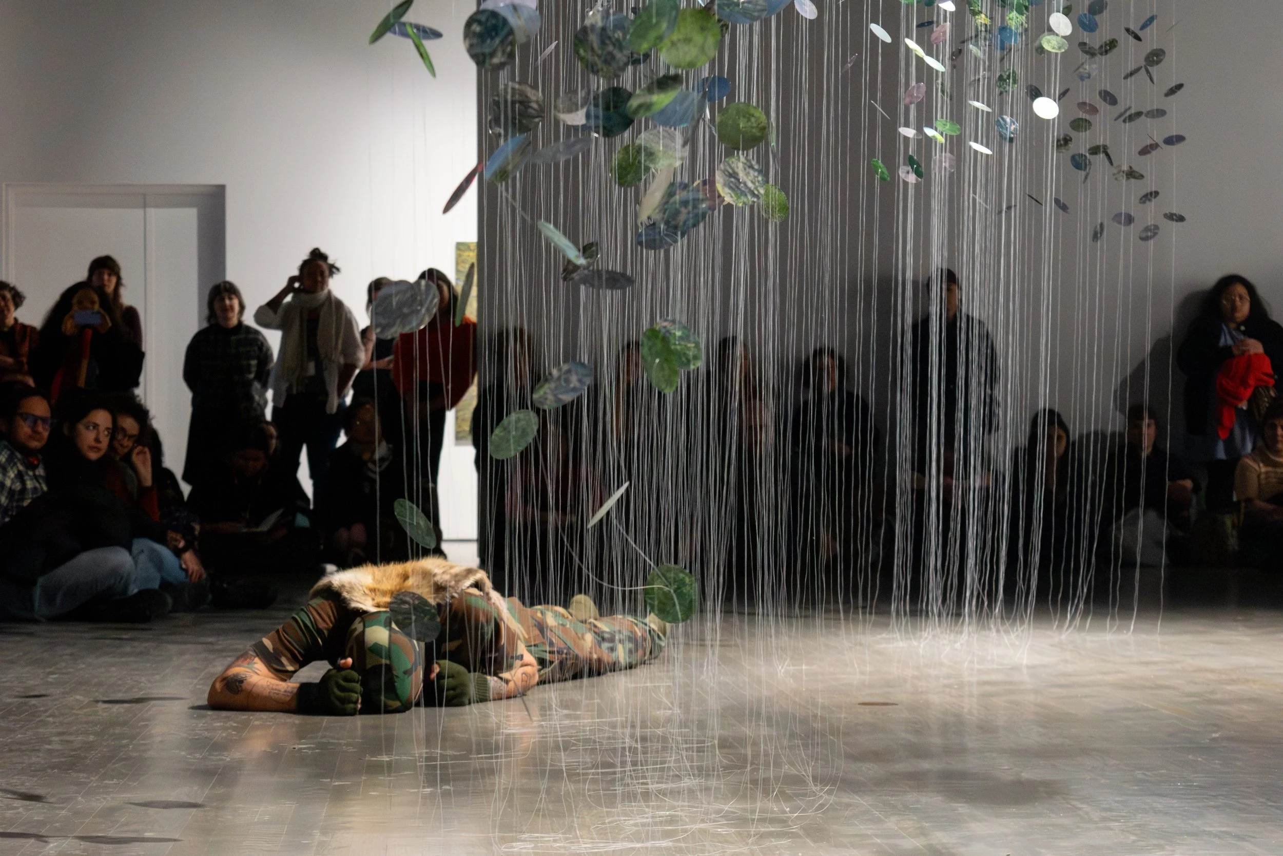 Morin’s repertoire of bodily motions also includes crawling. Thus, in his address to watersong, he lies face down on the floor and propels himself around the curtain of threads by slowly, arduously stretching his forearms forward to form a pinion, and dragging his body along (Figure 6). His back is draped with the beaver skin. A rendition of All Along the Watchtower by Yul Anderson plays in the background. This spectacle is quite riveting. It puts one in mind of a wounded animal, its body mangled by some trap, painfully inching its way along the shoreline.